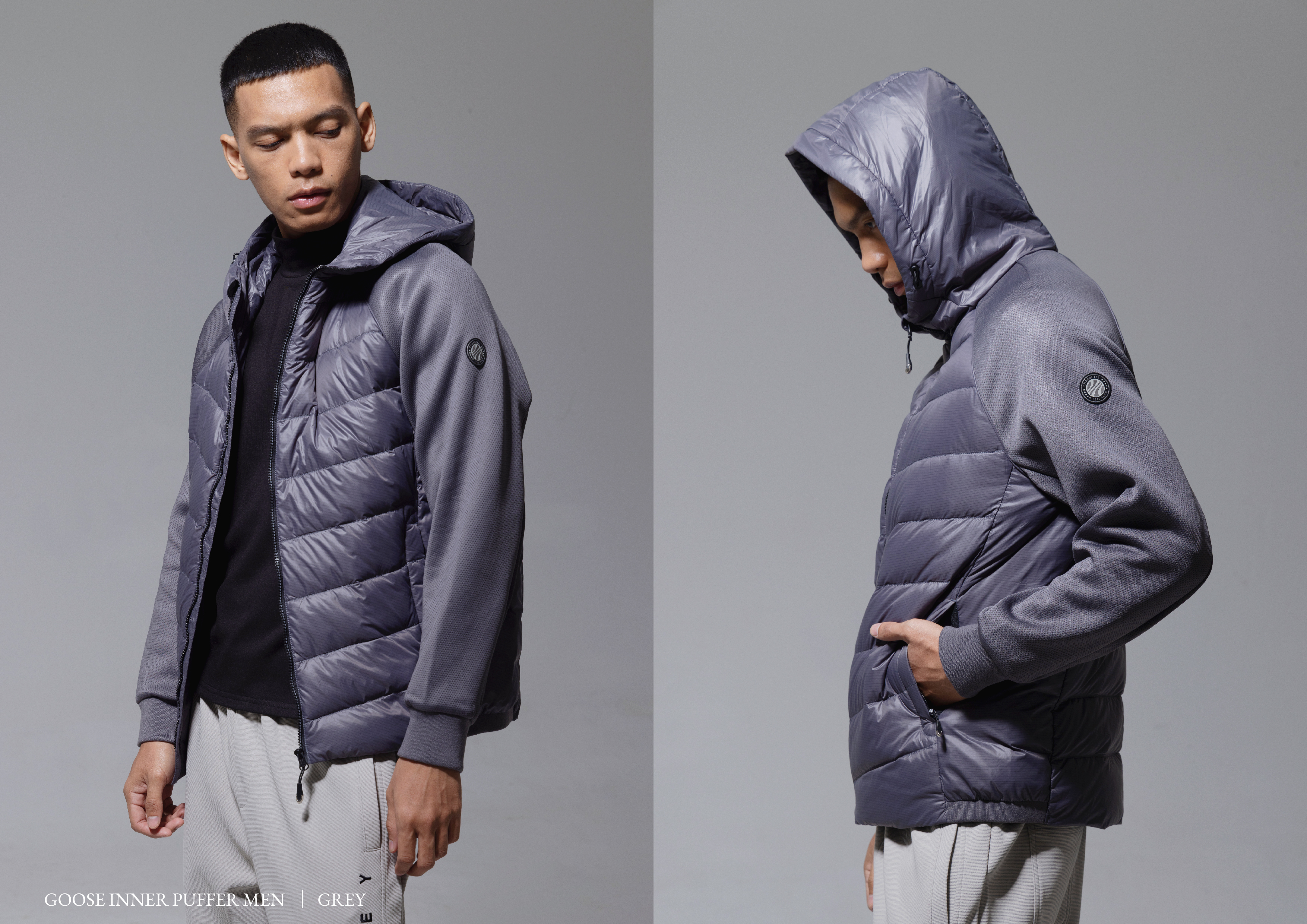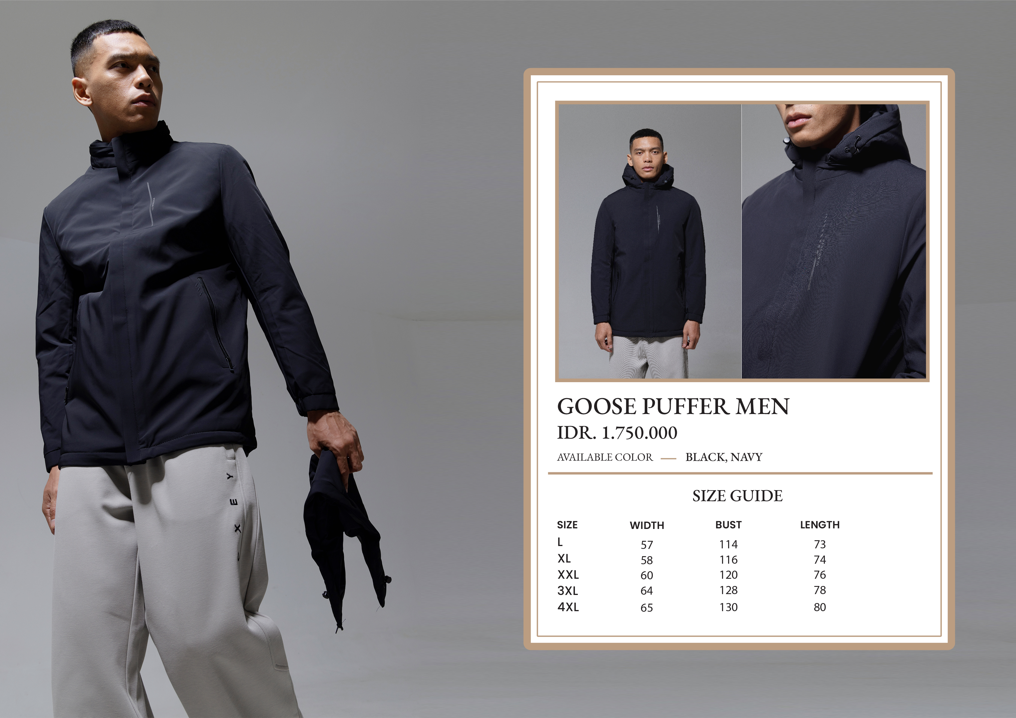 Inner Puffer Men Goose Down (100% Bulu Angsa) Colors : Black, Grey SIze : L, XL, XXL, 3XL, 4XL Bust L : 55cm (110) XL : 56cm XXL : 60cm (120cm) 3XL : 61cm (122cm) 4XL : 62cm (124cm) Length : L : 66cm XL : 71cm XXL :72cm 3XL : 73cm 4XL : 75cm