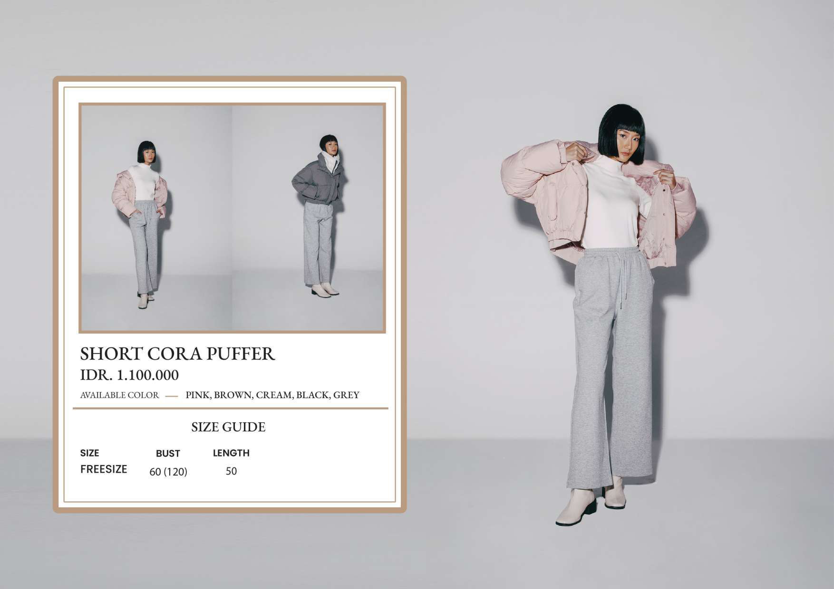 Short Cora Puffer Colors : Pink - Brown - Cream - Black - Grey Bust : 60cm Length : 50cm