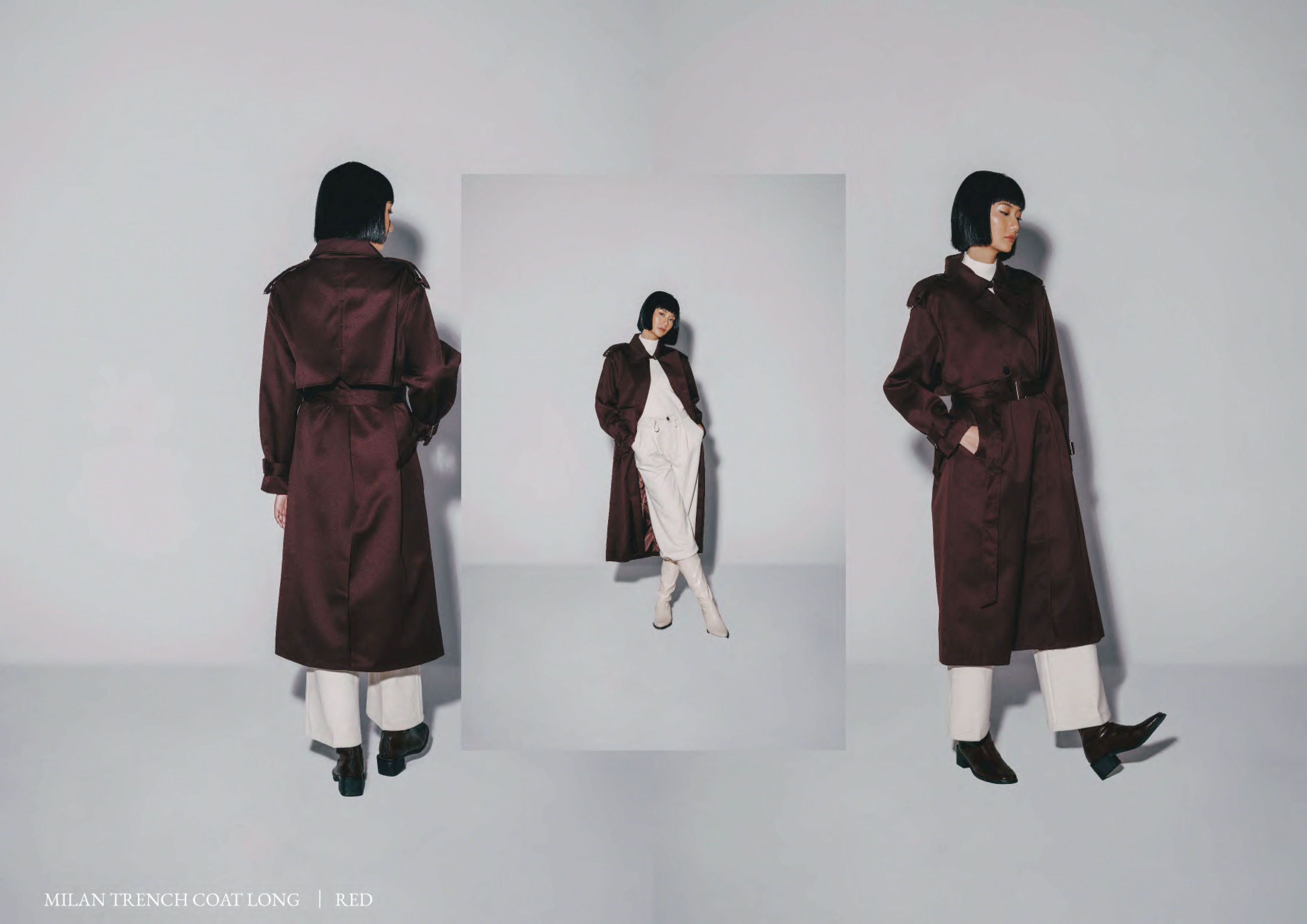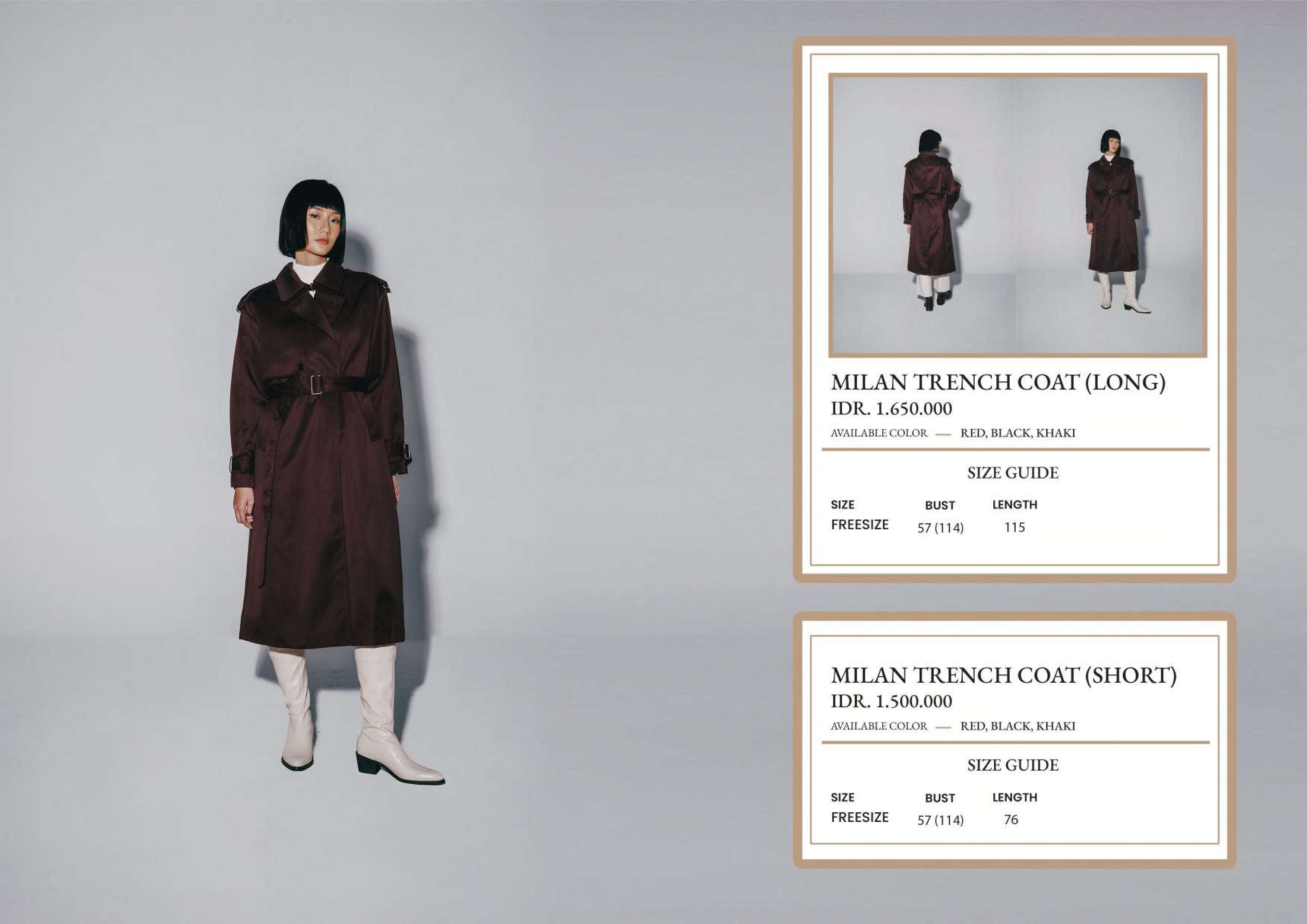 Milan Trench Coat (Long) Colors : Red, Black, Khaki Bust : 57cm (114cm) Length : 115cm