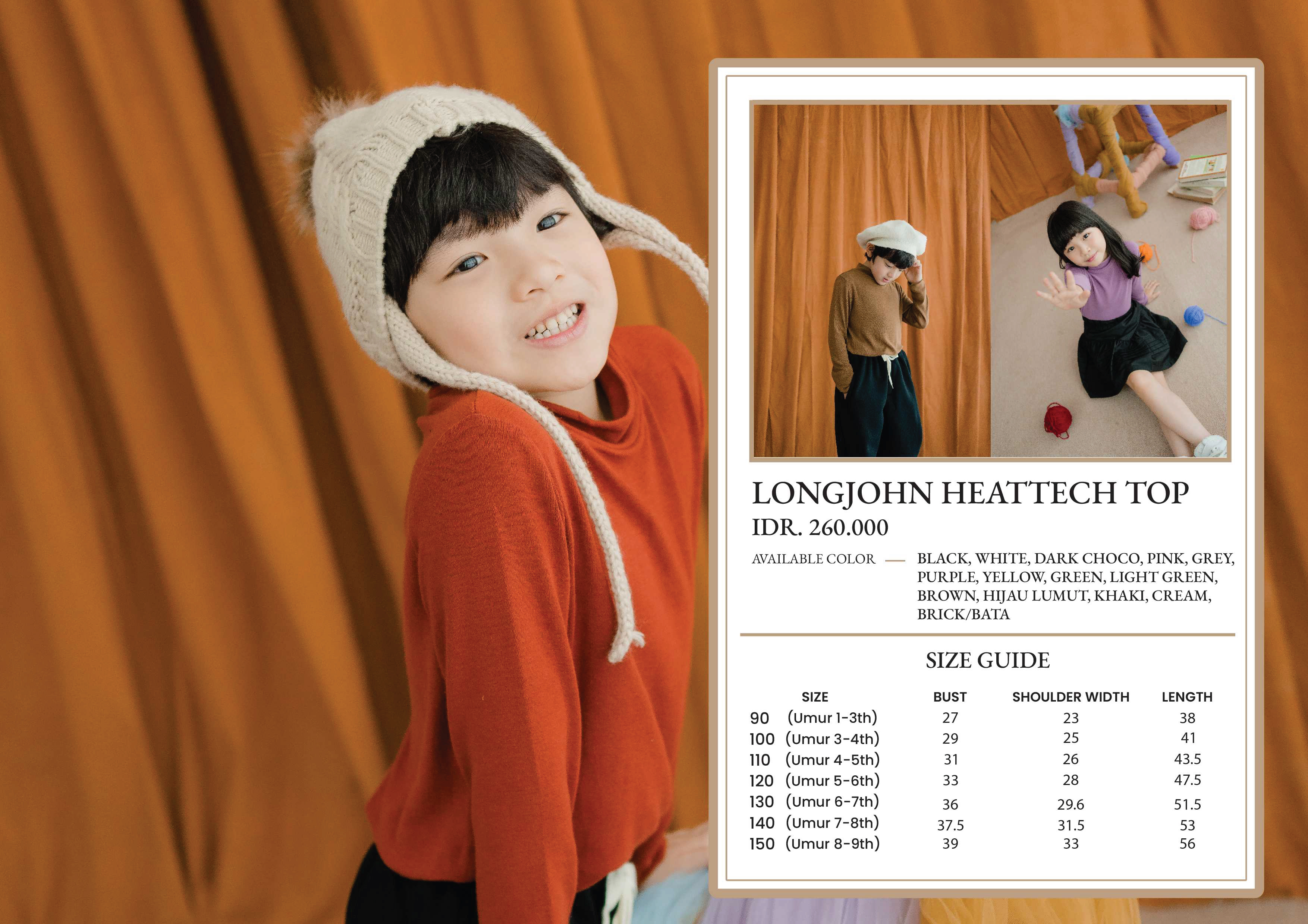 Longjohn Heattech Top Kids Colors : Black, Green, White, Light Green, Dark Choco, Purple, Pink, Yellow, Sage Green Size 90 (Umur 1-3th) Bust 27cm | Shoulder Width 23cm | Length 38cm Size 100(Umur 3-4th) Bust 29cm | Shoulder Width 25cm | Length 41cm Size 110 (Umur 4-5th) Bust 31cm | Shoulder Width 26cm | Length 43.5cm Size 120 (Umur 5-6th) Bust 33cm | Shoulder Width 28cm | Length 47.5cm Size 130 (Umur 6-7th) Bust 36cm | Shoulder Width 29.6cm | Length 51.5cm Size 140 (Umur 7-8th) Bust 37.5cm | Shoulder Width 31.5cm | Length 53cm Size 150 (Umur 8-9th) Bust 39cm | Shoulder Width 33cm | Length 56cm