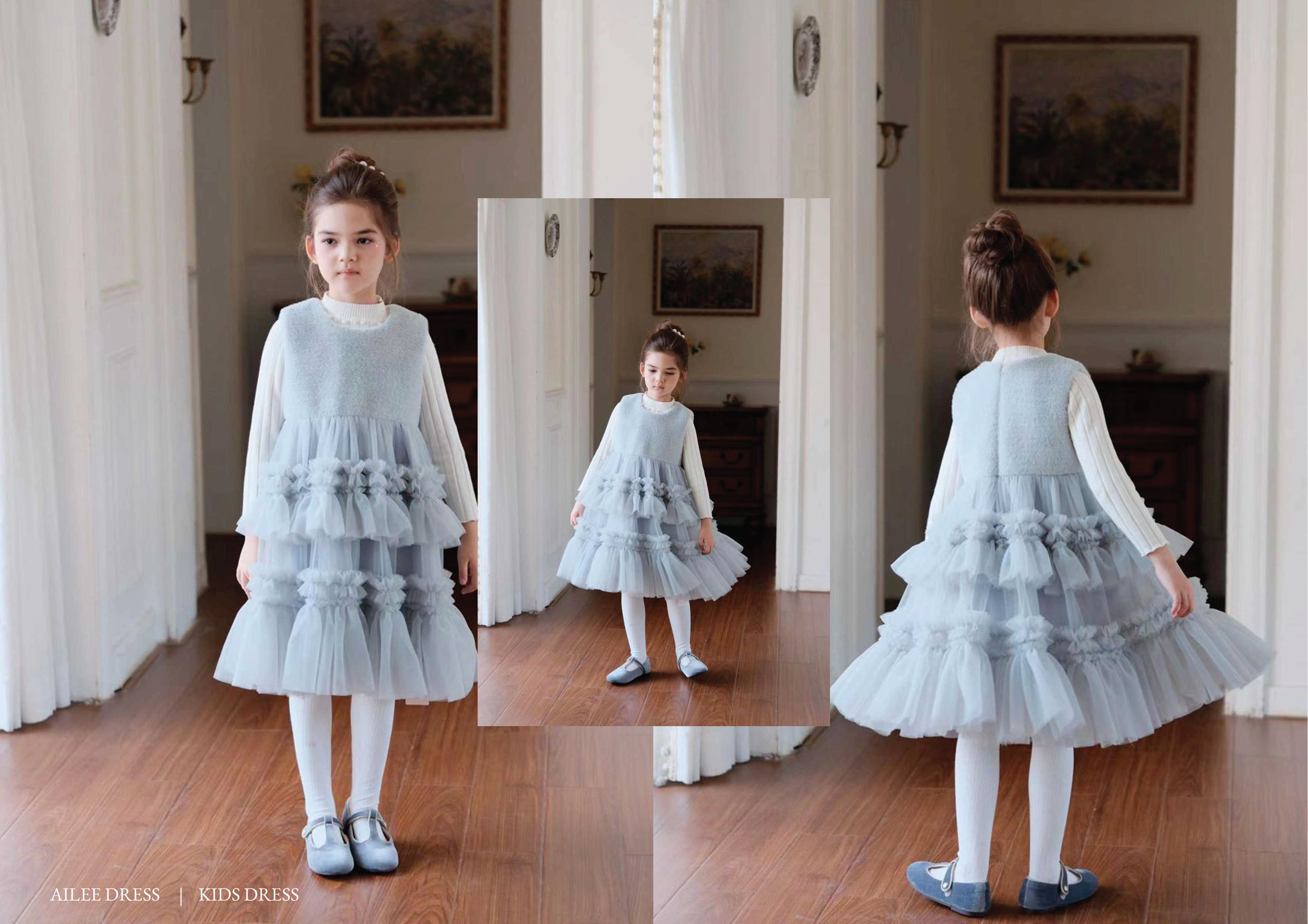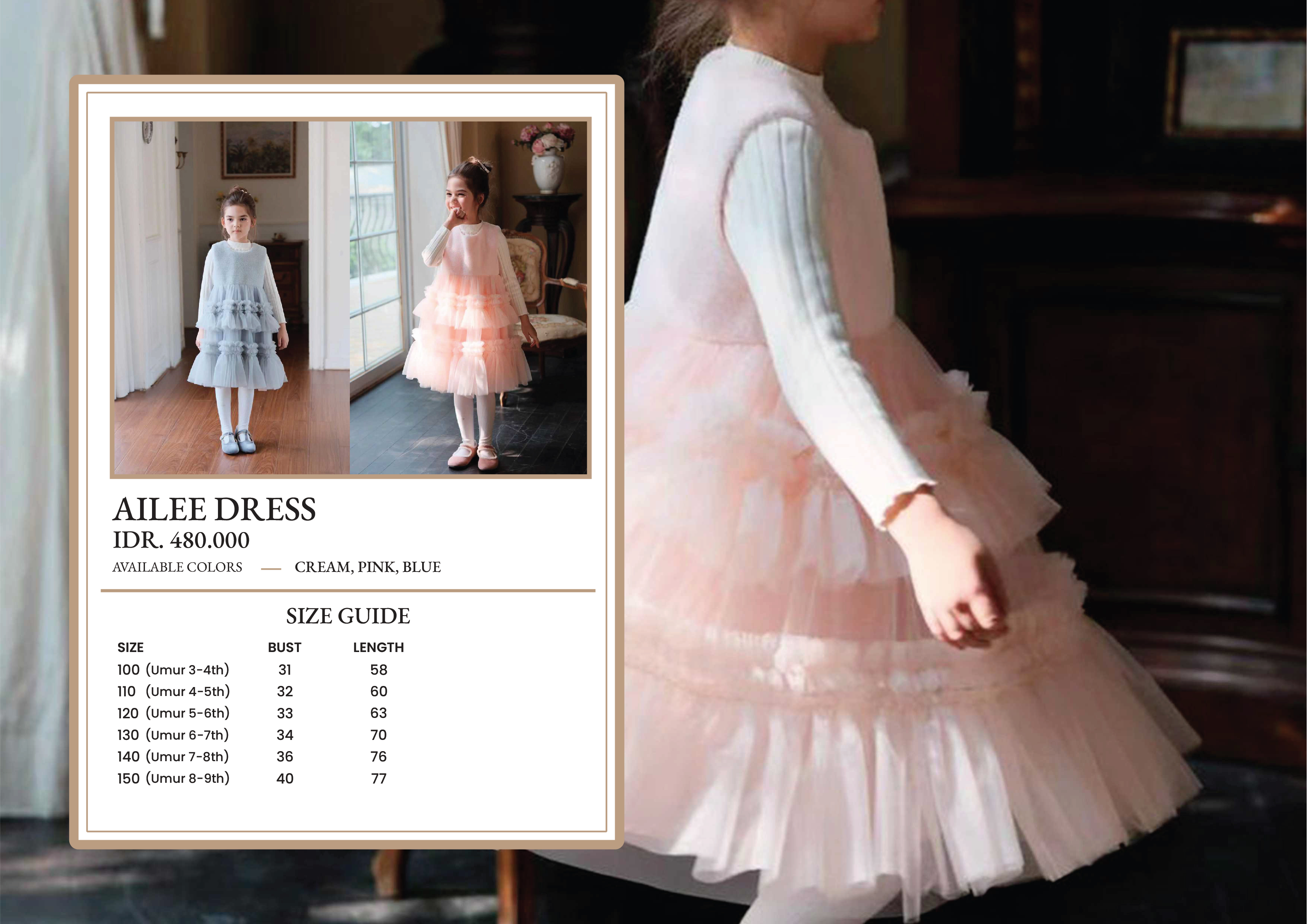 Ailee Dress Colors : Cream, Pink, Blue 100cm (3-4 th) : Bust 31cm – Length 58cm 110cm (4-5 th) : Bust 32cm – Length 60cm 120cm (5-6 th) : Bust 33cm – Length 63cm 130cm (6-7 th) : Bust 34cm – Length 70cm 140cm (7-8 th) : Bust 36cm – Length 76cm 150cm (8-9 th) : Bust 40cm – Length 77cm