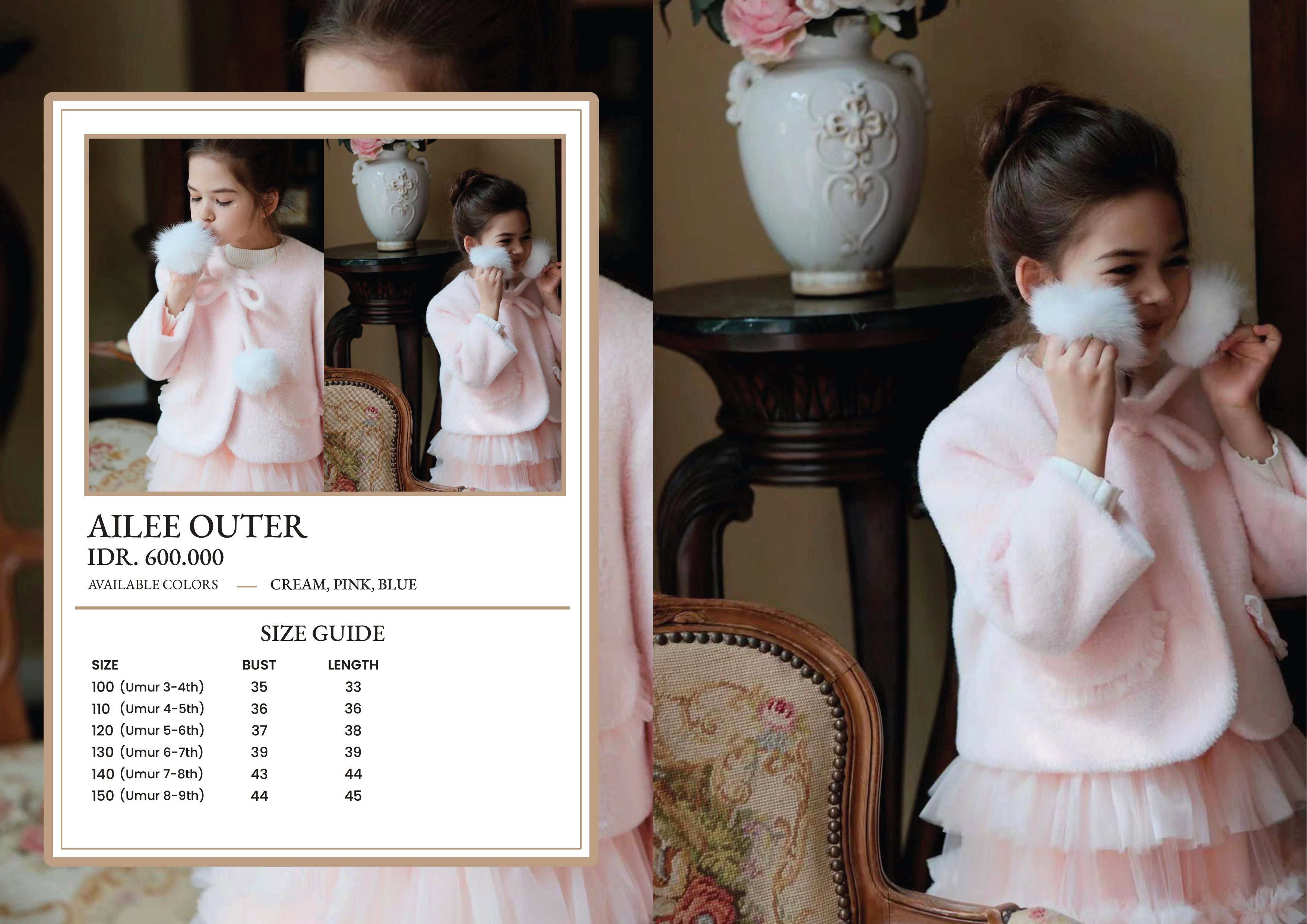 Ailee Outer Colors: Cream, Pink, Blue 100 (3-4 th) : Bust 35 – Length 33 110 (4-5 th) : Bust 36 – Length 36 120 (5-6 th) : Bust 37 – Length 38 130 (6-7 th) : Bust 39 – Length 39 140 (7-8 th) : Bust 43 – Length 44 150 (8-9 th) : Bust 44 – Length 45