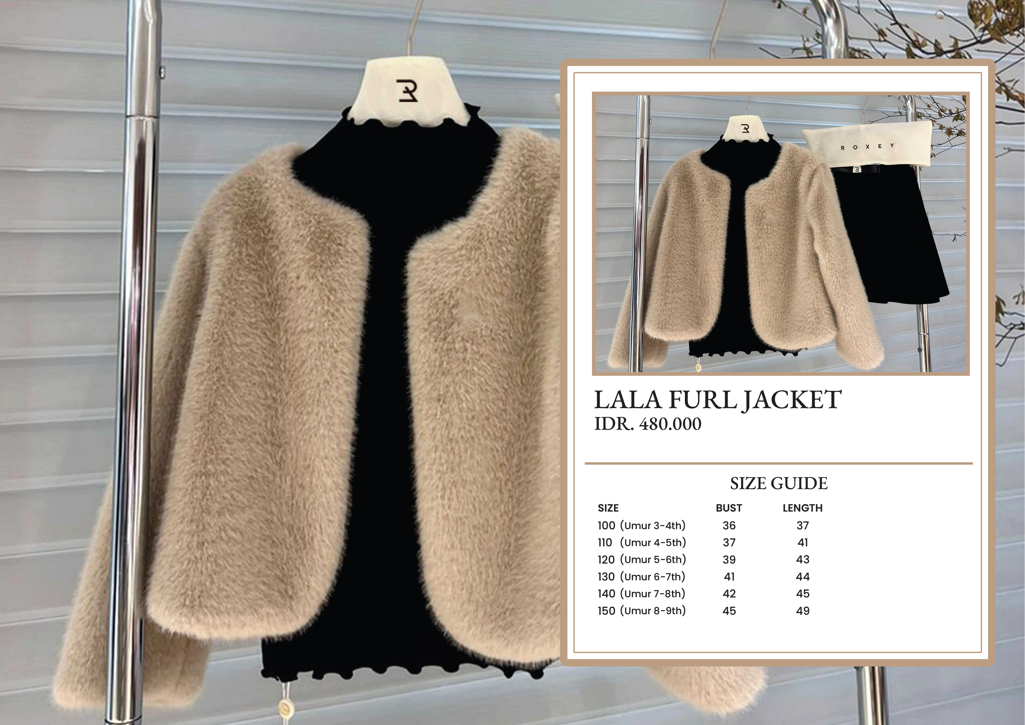 Lala Furl Jacket 100cm (3-4 th) : Bust 36cm – Length 37cm 110cm (4-5 th) : Bust 37cm – Length 41cm 120cm (5-6 th) : Bust 39cm – Length 43cm 130cm (6-7 th) : Bust 41cm – Length 44cm 140cm (7-8 th) : Bust 42cm – Length 45cm 150cm (8-9 th) : Bust 45cm – Length 49cm