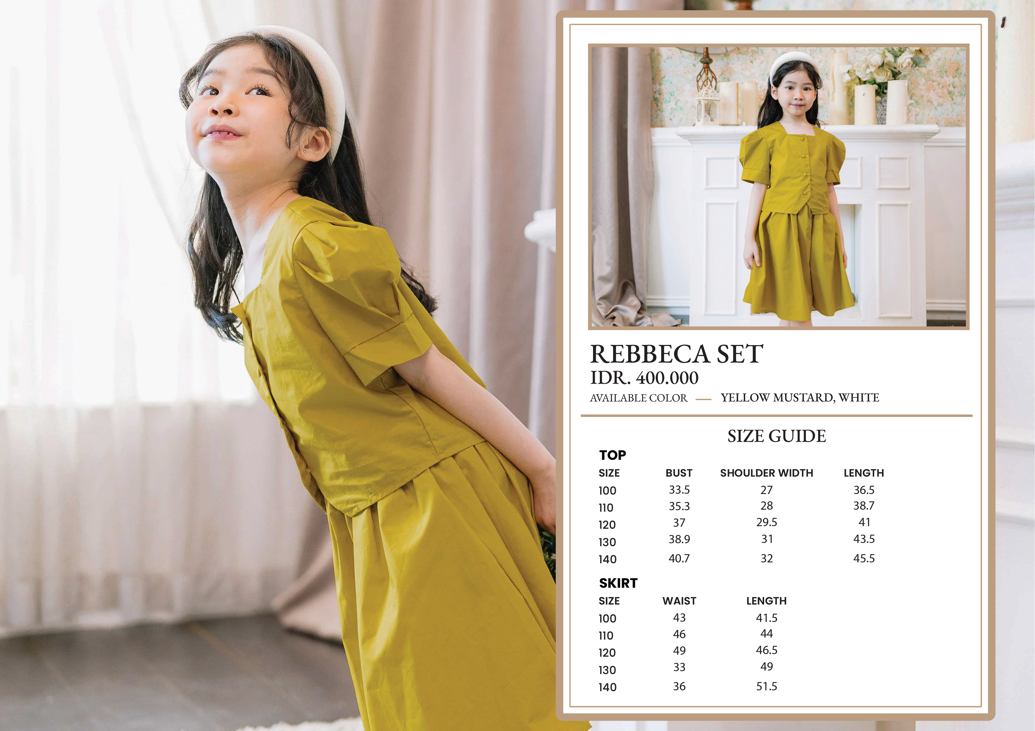 Rebbeca Set Colors: Yellow Mustard, White - 100cm TOP : Bust = 33.5cm - Shoulder Width = 27cm - Length = 36.5cm SKIRT : Waist = 43cm - Length Skirt = 41.5cm - 110cm TOP : Bust = 35.3cm - Shoulder Width 28cm- Length = 38.75cm SKIRT : Waist = 46cm - Length = 44cm - 120cm TOP : Bust = 37cm - Shoulder Width = 29.5 - Length = 41cm SKIRT : Waist = 49cm - Length = 46.5cm - 130cm TOP : Bust = 38.9cm - Shoulder Width = 31cm - Length = 43.5cm SKIRT : Waist = 52cm - Length = 49cm - 140cm TOP : Bust = 40.7cm - Shoulder Width = 32cm - Length = 45.5cm SKIRT : Waist = 55cm - Length = 51.5cm